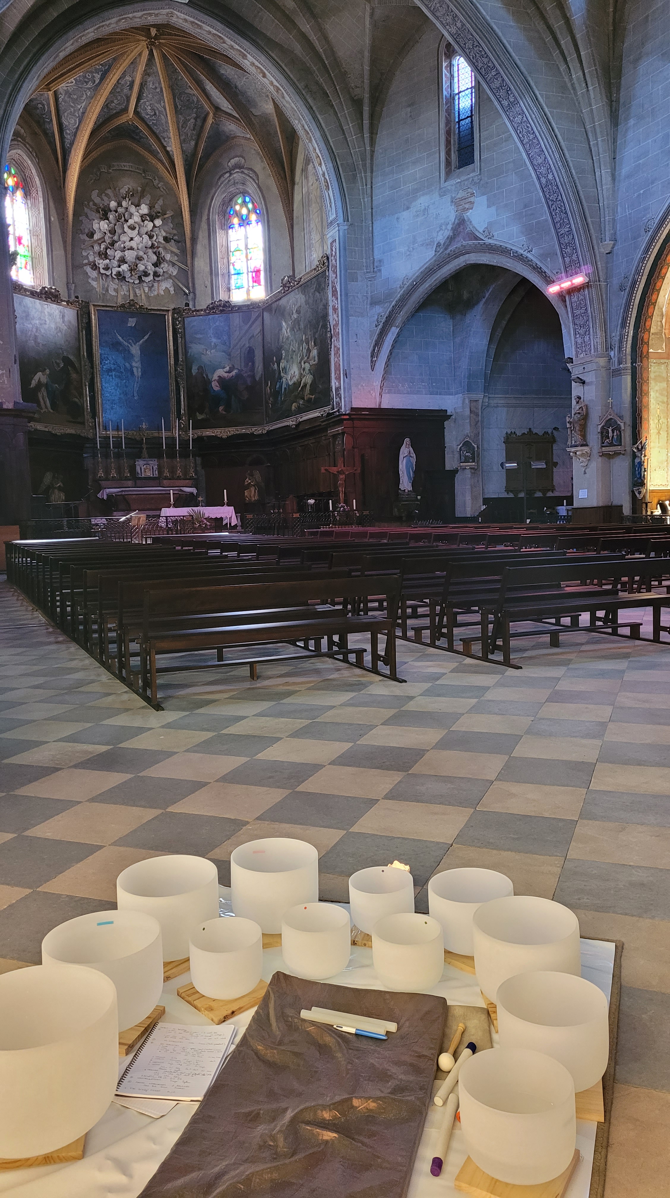 Dans cette très belle église de Vabres l’Abbaye au sol irrégulier d’origine…il est délicat d’installer les bols chantants. J’apprends comment trouver la stabilité car dans l’assise repose toute la force du jeu.