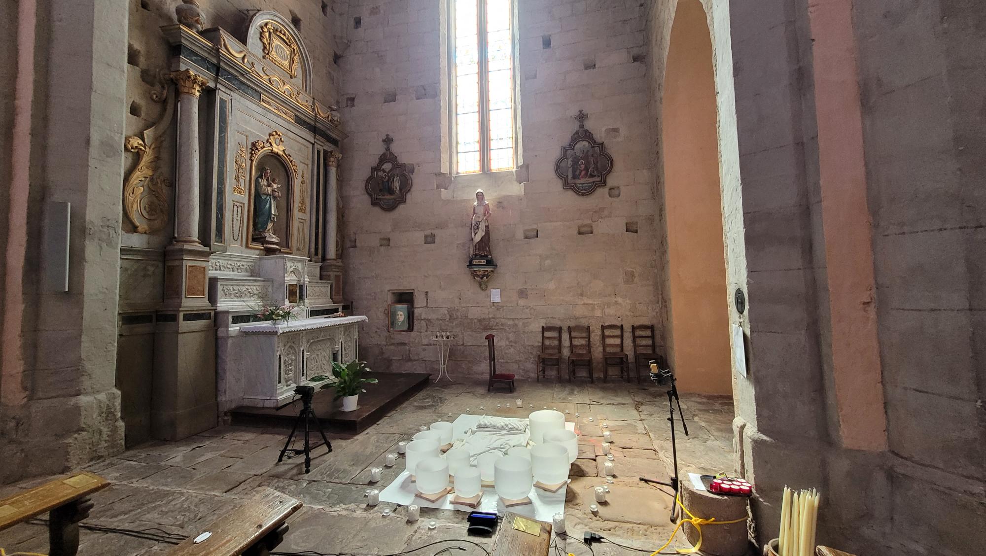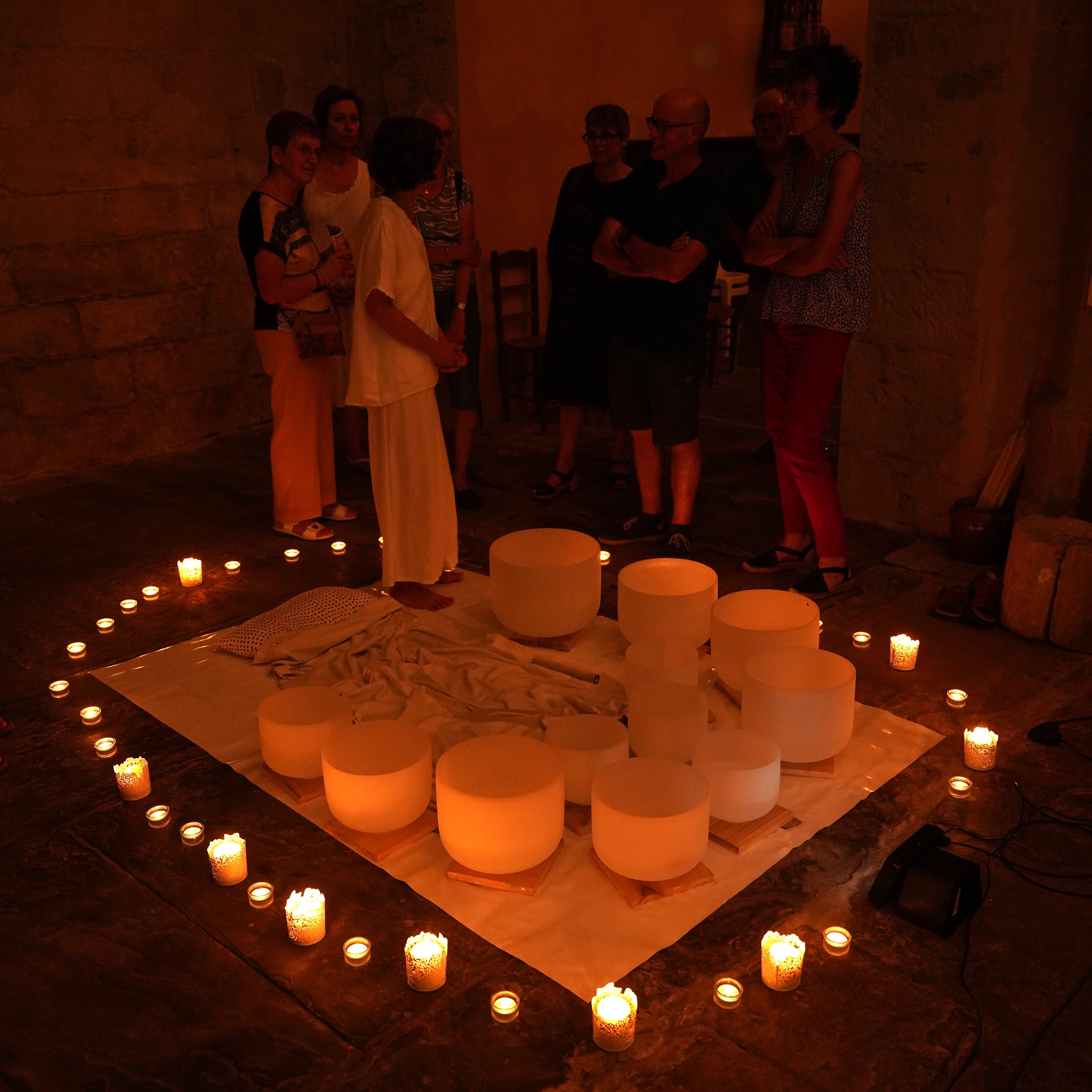 Vabres permet de jouer le soir en nocturne. Les contraintes d’occupation de l’Église-dans sa vie d’Église- et du festival nous obligent à partager ce lieu en place et en heure. Les bols se retrouvent donc sur le côté, dans une petite chapelle dédiée à Sainte Germaine avec laquelle je fais connaissance, à côté du cœur. L’acoustique y est très bonne, même si tout le public ne me verra pas jouer les bols chantants. Cela sera l’occasion d’échanger avec le public à la fin du spectacle.