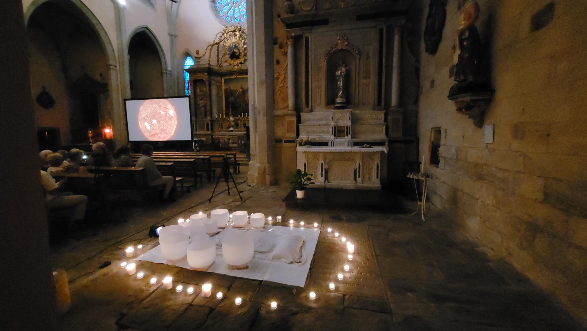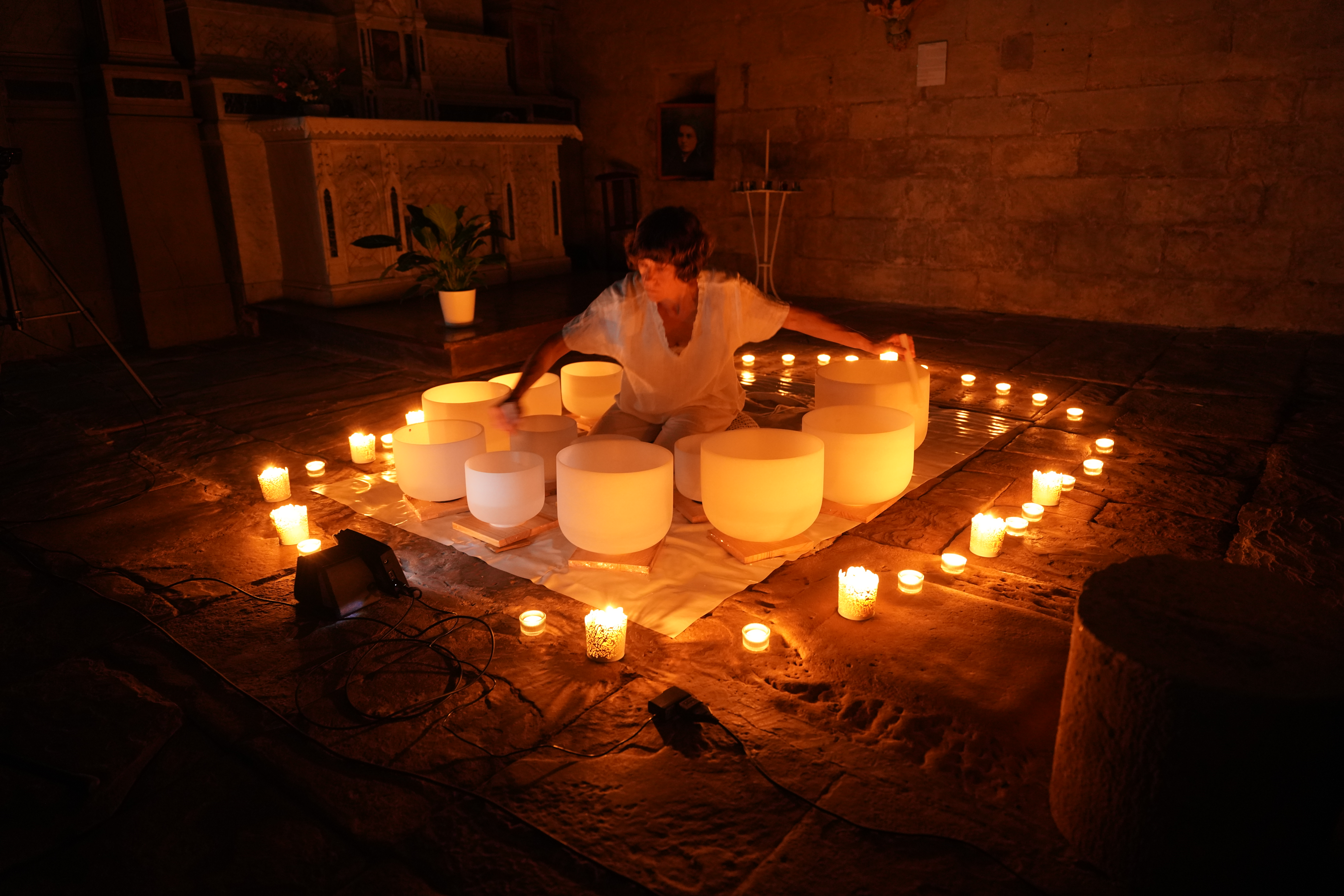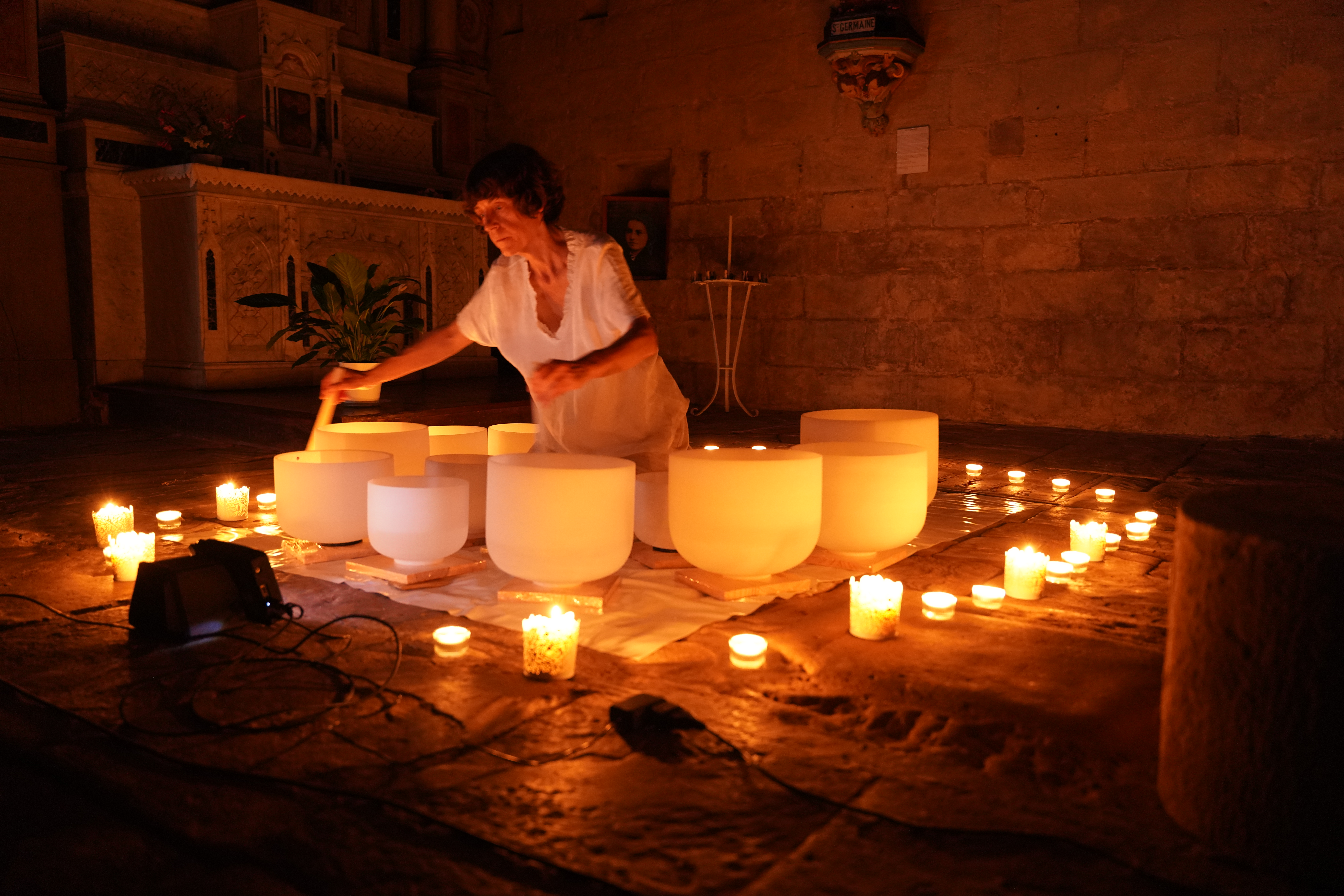 Les conditions idéales ont pu être groupées : un spectacle de nuit, les bols chantants dans le cœur visibles par tous, une bonne acoustique, un accord trouvé avec l’orgue.