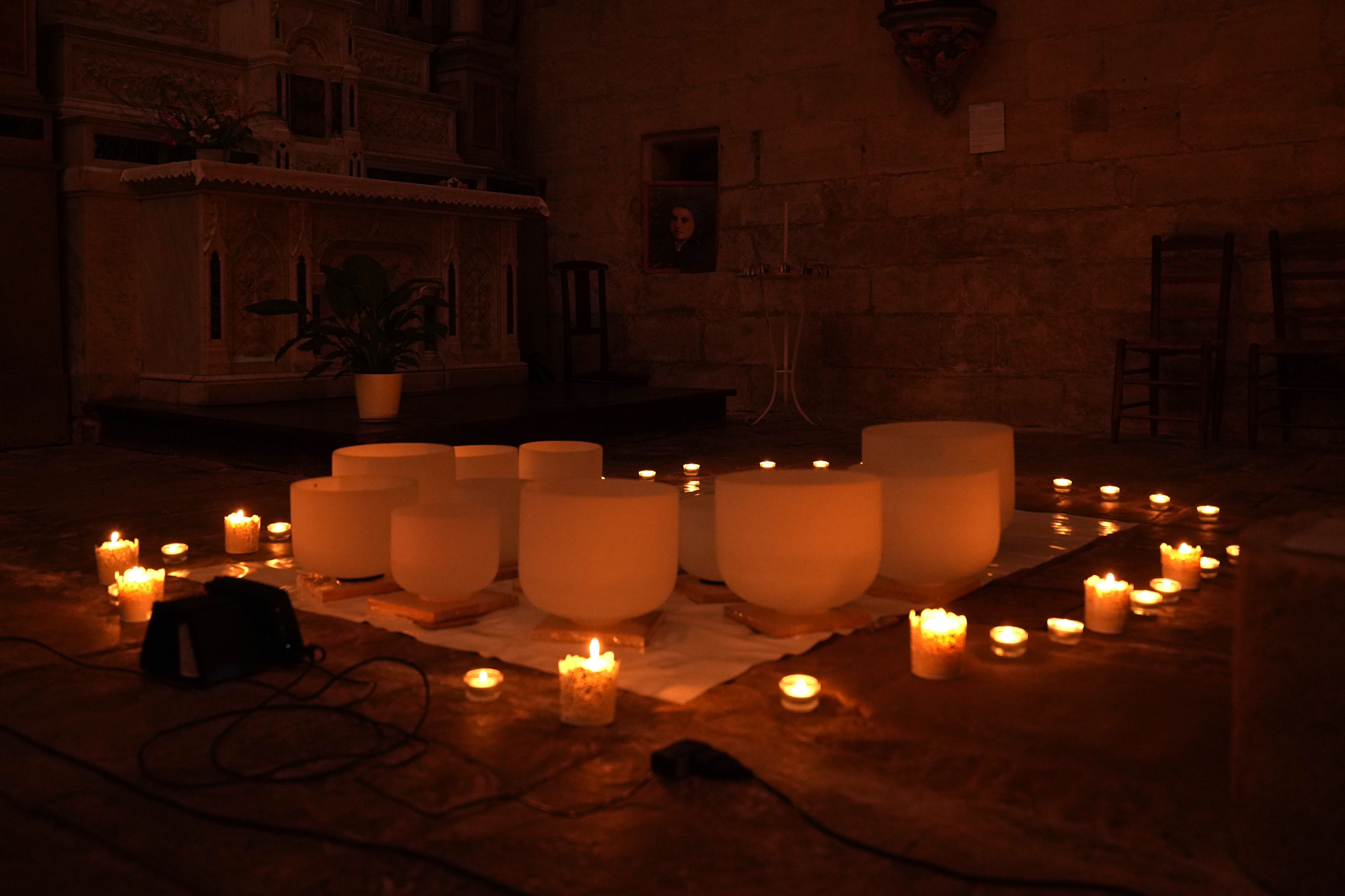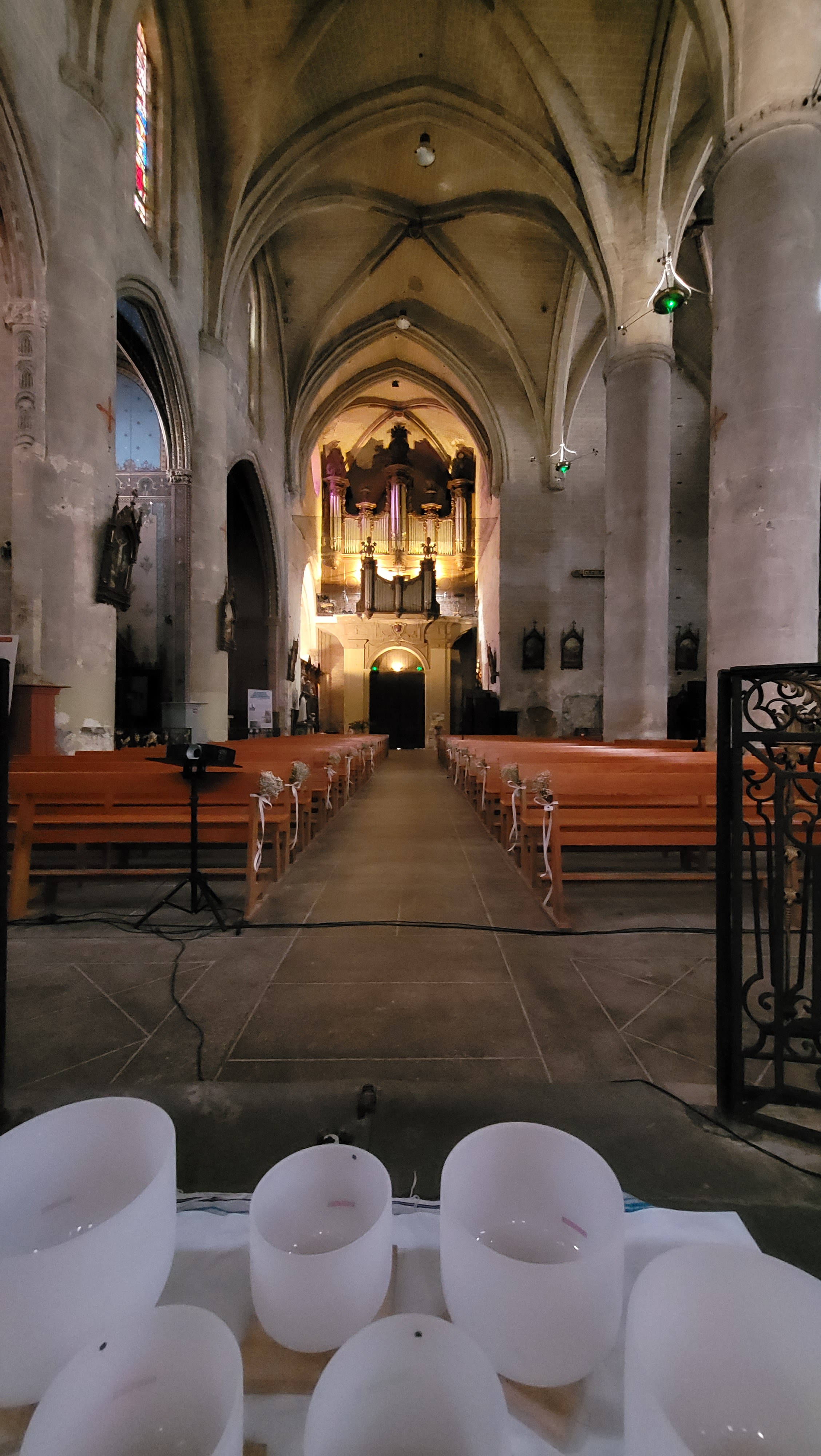Si durant les relaxations que je pratique de longue date, il n’ai jamais necessaire de monter en volume, ce fut pour moi l’occasion de tester comment monter en puissance sonore en jouant dans cette Église. Les bols en cristal de roche, en silice pure, demeurent des instruments fragiles à manier avec précaution. J’ai vu alors comment l’eau des bols, sous l’effet des intenses vibrations, entre quasiment en transe et s’éclabousse sur elle même. Une expérience incroyable.
