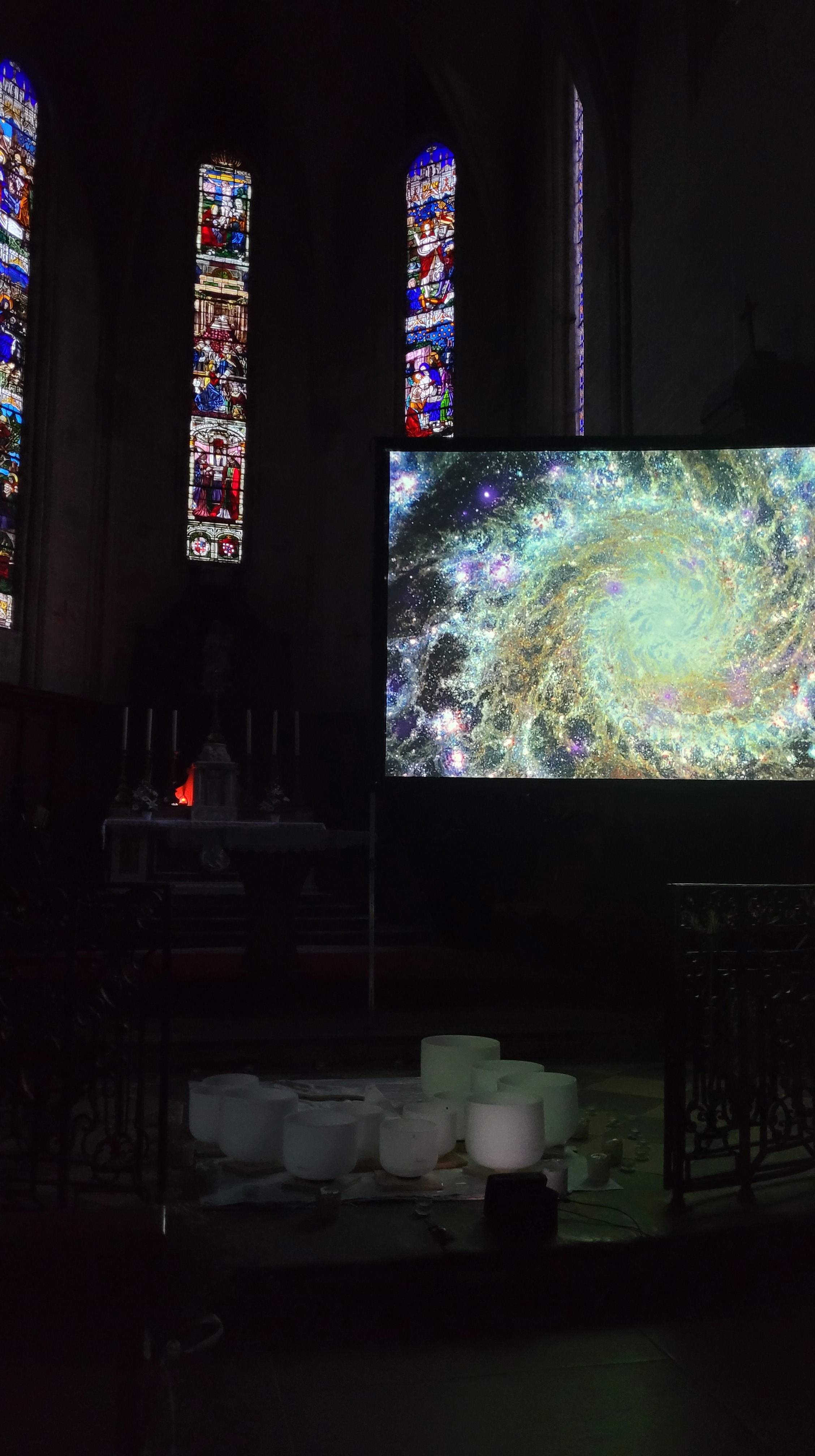 La rencontre de notes similaires est un phénomène saisissant. Une synergie s’opère dans laquelle la note est portée, tout en « brillant ». Le coté cosmique des bols chantants en cristal résonne avec le coté tellurique de l’orgue dans des harmoniques complémentaires qui fait qu’on ne sait plus qui joue quoi… on ne distingue plus orgue et bols chantants de façon séparé.
